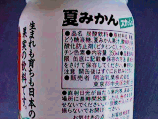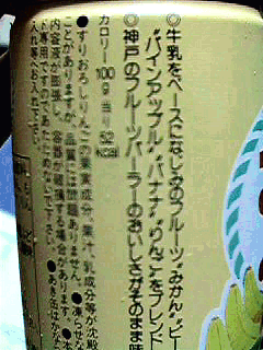 みかん(しかも,うんしゅうみかん)とピーチというなんか分離しそうなカップリングに,”すりおろした”リンゴがミックス。どろりとバナナが入って,とどめはパインアップルだだだ。なんでも混ぜればいいってもんじゃ,ないと思いますが(しかも乳飲料)。