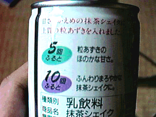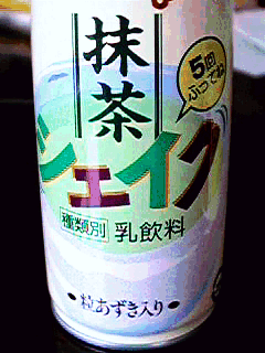 なにもシェイクするのはプリンだけじゃない,とばかりに登場。「抹茶シェイク」・・・とここまではわかるんだけど,缶には誇らしげに「乳飲料」の文字が。しかも「粒あずき入り」なのであった。おいおい。