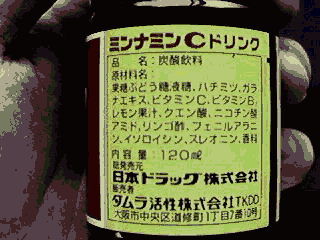 おもわず手がふるえてピンぼけしてしまった,究極のジャンクドリンクその2「ミンナミンCドリンク」。こりゃ,どう見ても「オロナミンCドリンク」である。