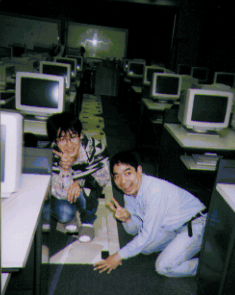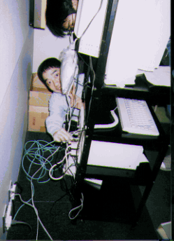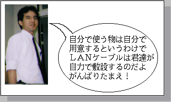 たいへんだったのは,先生機周辺を片づけた生徒であろう。なにしろNetWareのサーバ付近はケーブルの魔掘と化している。なぜか外部ルータのパソコンとモニターの間にビデオデッキが挟まっているし(新しいオプションでしょうか?),誰かが破壊した先生用の椅子の傍らにカラープリンタが転がっている。いったん接続をはずすと,何がなんだかわからなくなるのである。