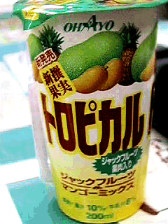 「新撰果実トロピカル」というすごい名前のジュース。これだけならいんだだが,”ジャックフルーツ&マンゴーミックス”がすごい。さらにパイナップルも入っているようなんだが,パッケージを見るとどうやらジャックフルーツというのは,トゲトゲの生えた洋なしのようなものであることが想像できる。