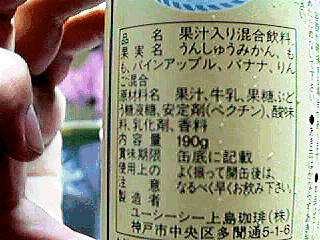みかん(しかも,うんしゅうみかん)とピーチというなんか分離しそうなカップリングに,”すりおろした”リンゴがミックス。どろりとバナナが入って,とどめはパインアップルだだだ。なんでも混ぜればいいってもんじゃ,ないと思いますが(しかも乳飲料)。